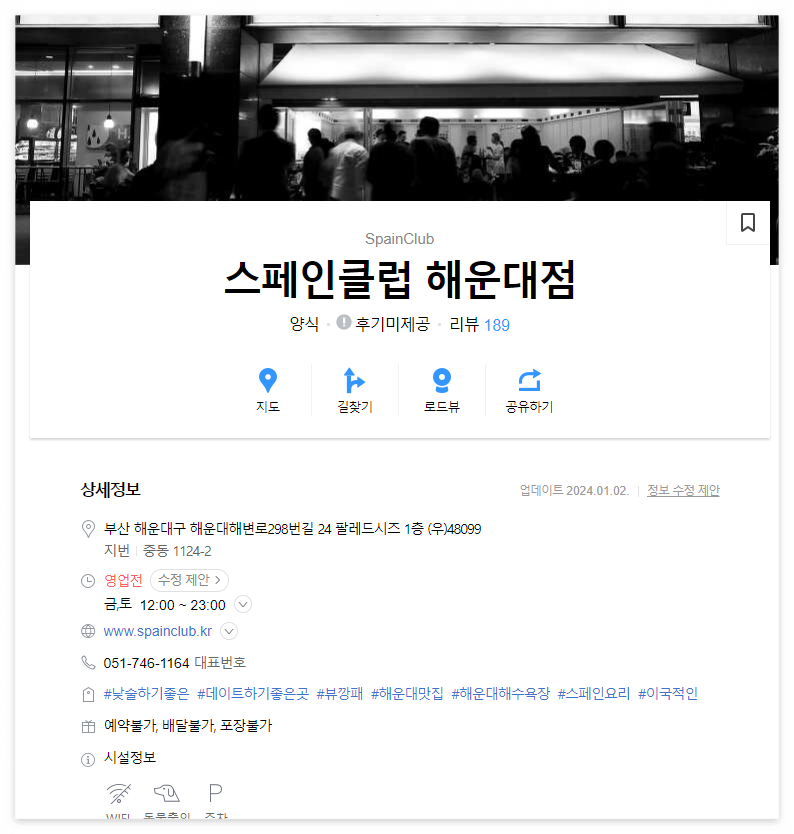 ◾ 스페인클럽은 예전에 회사 동료들과 방문한 스페인 음식점입니다. 외부 테라스가 있어서, 요즘 같은 날씨에 방문하기 딱 좋을 것 같습니다. 다양한 메뉴가 있어서, 먹을 음식을 미리 선택하는 것도 좋은 방법일 것 같습니다. 애견 동반이 가능한 음식점으로, 낮에는 강아지와 함께 산책을 하고 식사하기에도 좋을 것 같습니다. 음식도 크게 자극적이지 않고, 와인이나 맥주와 함께 먹으니 정말 맛있었습니다.