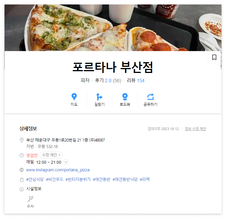◾ 포르타나도 해리단길 입구에 바로 있는 피자집입니다. 눈에 띄는 간판 덕분에 찾기 쉬울 겁니다. 애견 동반은 가능하지만 야외 테라스에서만 가능하다고 하네요. 2층까지 있고 단체석도 마련되어 있어 넉넉하고 편하게 식사할 수 있습니다. 해운대에 갈 때 한식이나 양식과 같이 큰 양이 부담스럽다면 한 조각씩 간단히 먹기 좋을 것 같아요. 특히 날씨 좋은 날에는 테라스석을 이용하여 평화롭게 피자를 즐길 수 있습니다. 피자 외에도 치킨이나 감자튀김 등 다양한 메뉴를 판매하기 때문에 취향에 맞게 맛있게 드실 수 있습니다.